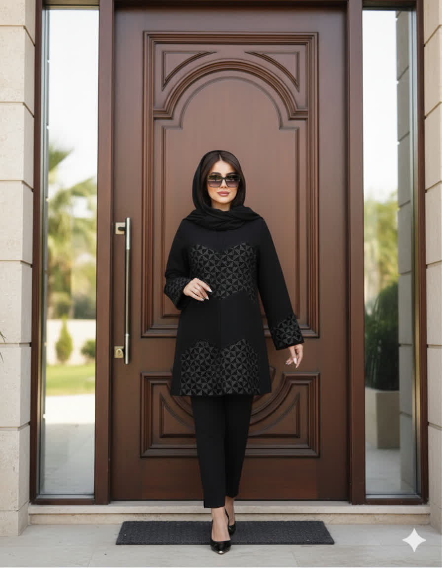 • 🔶 جزئیات طراحی: پنلهای مخمل سوزندوزی شده به صورت متقارن در جلو و لبه آستینها؛ مجهز به قزن مخفی (قابلیت استفاده به صورت جلو باز و بسته)
