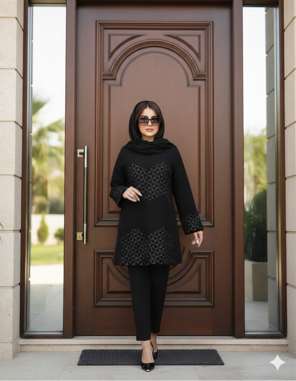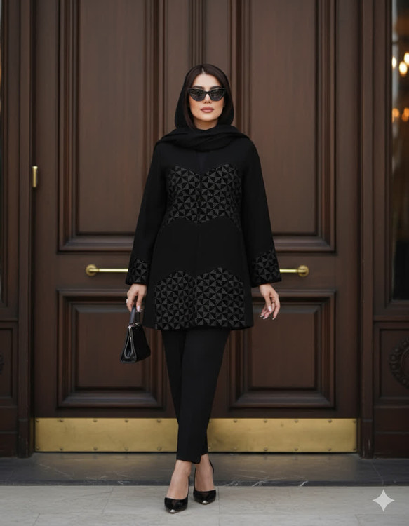 کد 0324: اگر به دنبال استایلی هستید که بدون کلام، از وقار شما سخن بگوید، این کت شاهکارِ ماست. ترکیب پارچه شانتون با پنلهای مخمل که با ظرافتِ تمام سوزندوزی نقرهای شدهاند، تضادی بینظیر از مات و براق ایجاد کرده که در شب و روز، درخشش خاص خود را دارد.